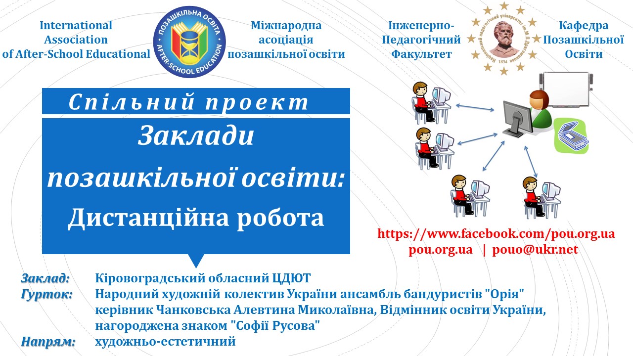 Керівник – Чанковська Алевтина Миколаївна – Відмінник освіти України, вихованцям он-лайн показує вправи постановки руки бандуриста та вдосконалення технічних навичок гри на бандурі. Цей вид роботи дуже важливий, щоб не втрачати виконавських навичок.