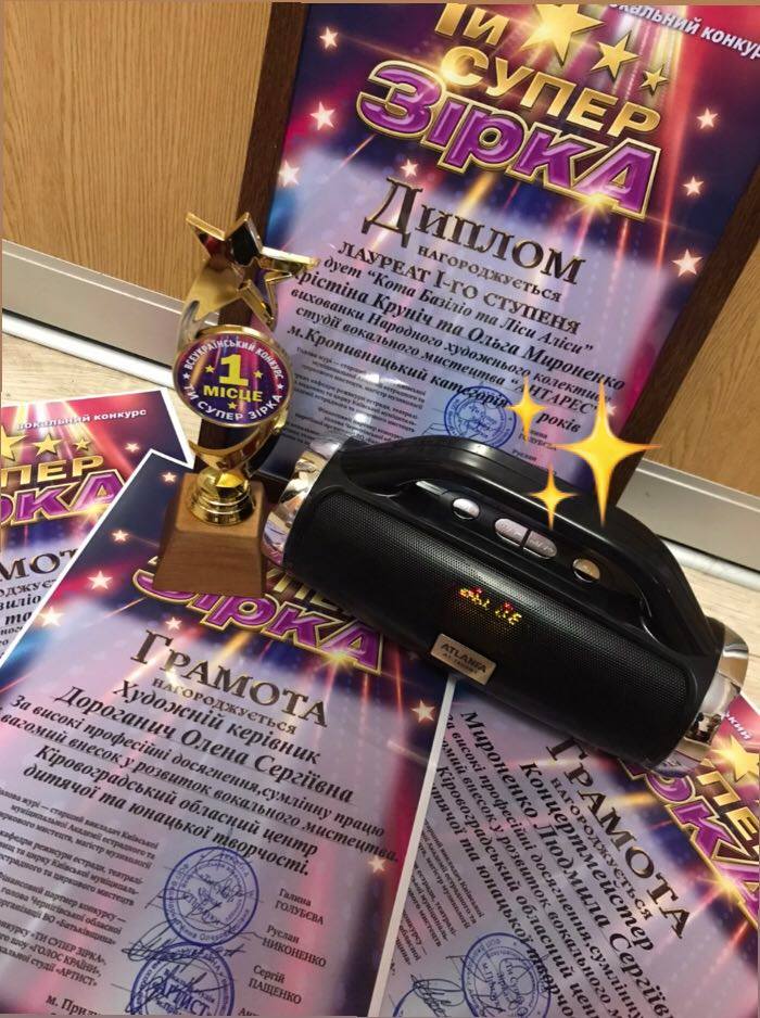 За свій яскравий номер «Пісня Кота Базиліо та Ліси Аліси» у номінації естрадний вокал дівчатка отримали пам’ятний кубок та чудовий подарунок – портативну колонку, а викладач Олена Дороганич та акомпаніатор Людмила Мироненко – подяки за високий професіоналізм і вагомий внесок у розиток вокального мистецтва. Вітаємо наших зірочок з перемогою! Бажаємо успіхів і надалі!!!
