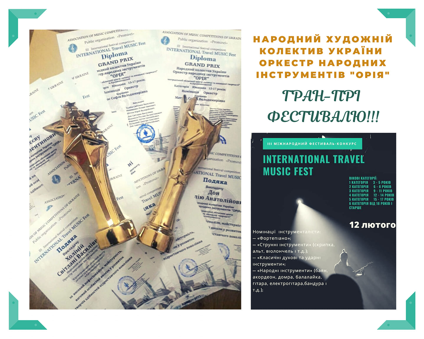 🎉 Наш Народний художній колектив України оркестр народних інструментів “Орія” отримав Гран-прі 🏆на Міжнародному фестивалі-конкурсі “International travel music fest”, фінал якого відбувся 12 лютого 2021 року у м.Харкові!