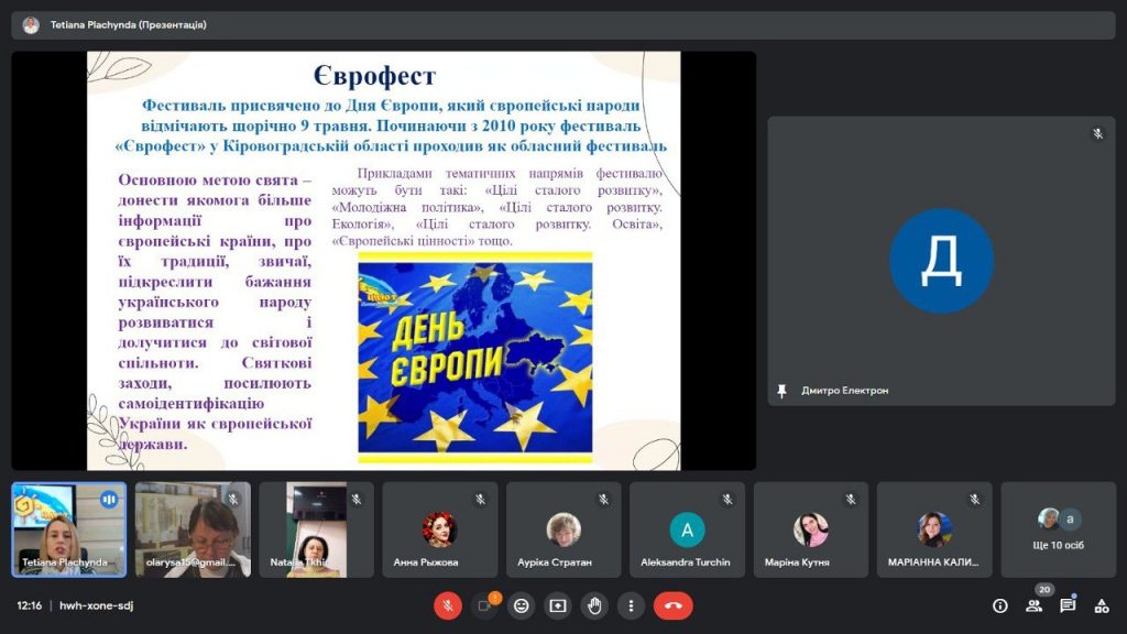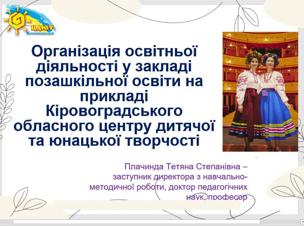 Відповідно до навчального плану університету, наразі здобувачі освіти третього року навчання проходять навчально-педагогічну практику, метою якої є вивчення практичної діяльності закладів позашкільної освіти. Тетяна Степанівна ознайомила здобувачів вищої освіти щодо аспектів організації освітнього процесу у Кіровоградському обласному ЦДЮТ, повідомила про функціонуючі гуртки та окреслила їхню діяльність, охарактеризувала освітні проєкти, які започатковані у закладі тощо.
