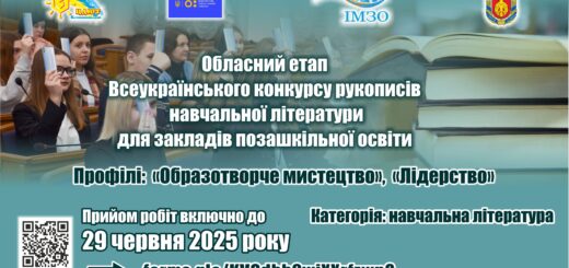 Триває прийом робіт І (обласного) етапу Всеукраїнського конкурсу рукописів навчальної літератури для позашкільних навчальних закладів системи освіти за художньо-естетичним напрямом. Роботи приймаються за наступними профілями: Образотворче мистецтво; Лідерство (діяльність органів громадського самоврядування закладу позашкільної...