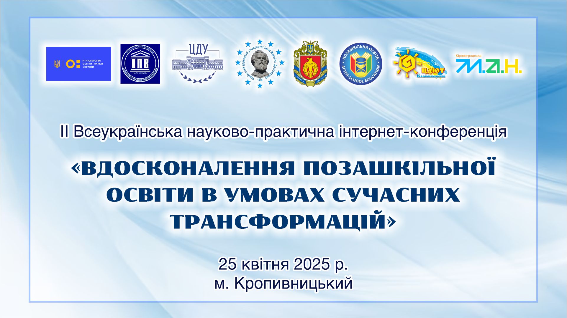 Інформаційний лист Сертифікати учасників ПРОГРАМА ІІ Всеукраїнської науково-практичної інтернет-конференції “ВДОСКОНАЛЕННЯ ПОЗАШКІЛЬНОЇ ОСВІТИ В УМОВАХ СУЧАСНИХ ТРАНСФОРМАЦІЙ Матеріали ІІ Всеукраїнської науково-практичної інтернет-конференції “ВДОСКОНАЛЕННЯ ПОЗАШКІЛЬНОЇ ОСВІТИ В УМОВАХ СУЧАСНИХ ТРАНСФОРМАЦІЙ Резолюція конференції Повна версія відеозапису конференції ВІДКРИТТЯ РОБОТИ КОНФЕРЕНЦІЇ ПЛЕНАРНЕ ЗАСІДАННЯ