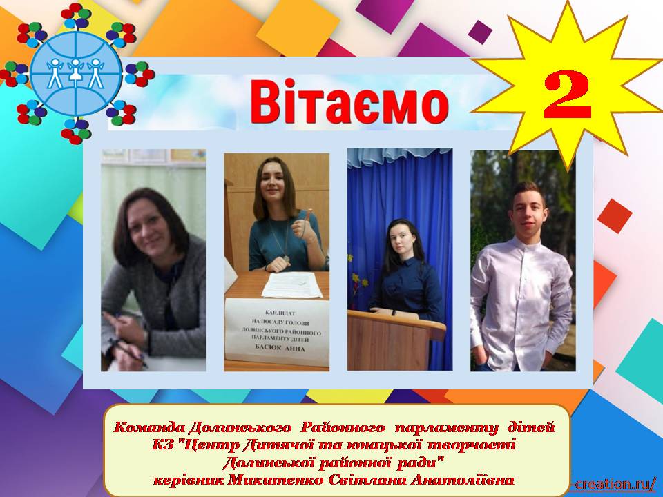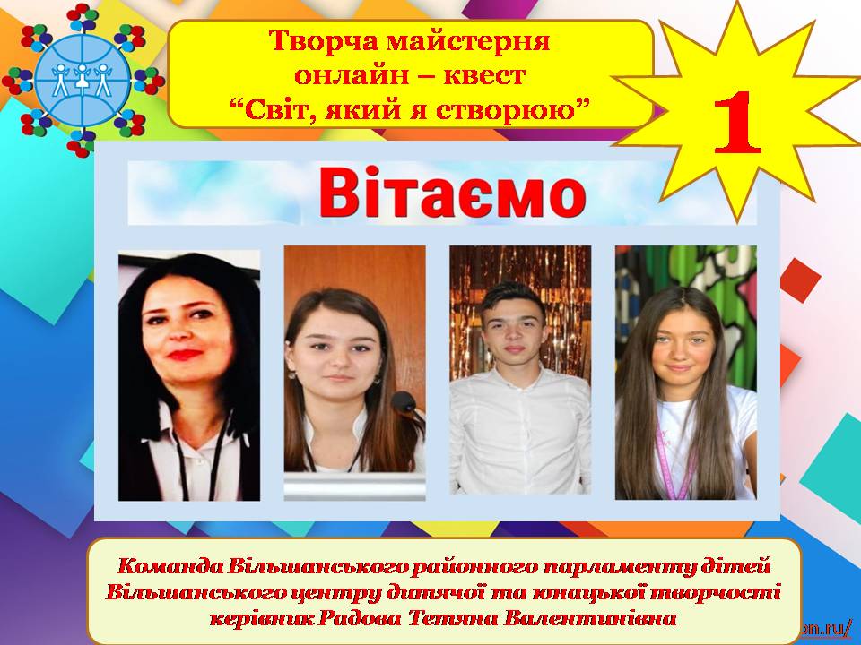 🥇Команду “Вільшанський районний парламент дітей”, Вільшанського ЦДЮТ за зайняте 1 місце в творчій майстерні – онлайн – квесті “Світ, який я створюю” Керівник РАДОВА Тетяна Валентинівна