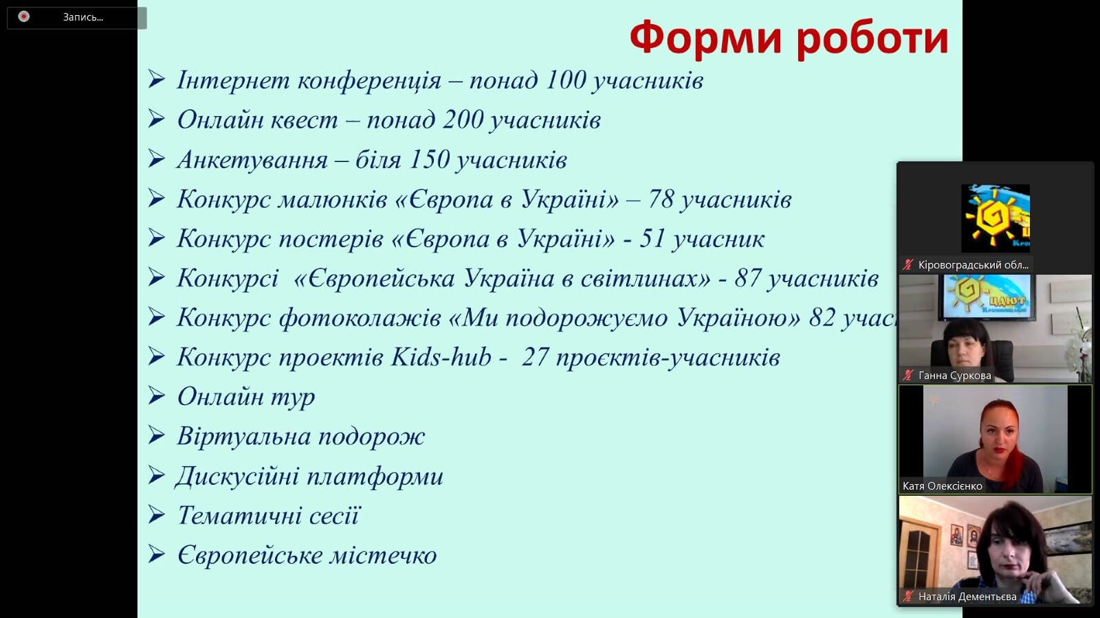 Директор обласного ЦДЮТ Ганна Суркова проінформувала учасників наради з питань завершення навчального року; про підсумки Всеукраїнського фестивалю дитячої та юнацької творчості, присвяченого Всесвітньому Дню Землі; проектах Міжнародної Асоціації Позашкільної Освіти до 20-річчя прийняття Закону України «Про позашкільну освіту».