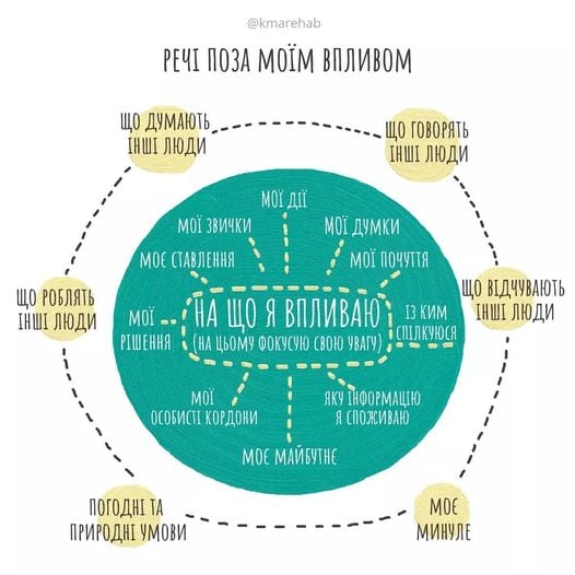 Психологічний комфорт – це відчуття задоволення, прийняття оточення, відповідність стану людини до навколишніх умов існування. Для його збереження важливо розмежовувати те, на що можливо впливати і те, що важливо приймати як є.