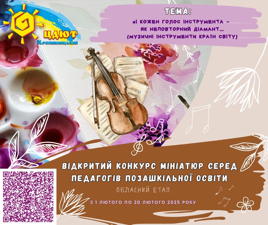 Запрошуємо до участі в обласному етапі відкритого конкурсу мініатюр серед педагогів позашкільної освіти, на тему: «І кожен голос інструмента – як неповторний діамант… (музичні інструменти країн світу)» (заочний формат).