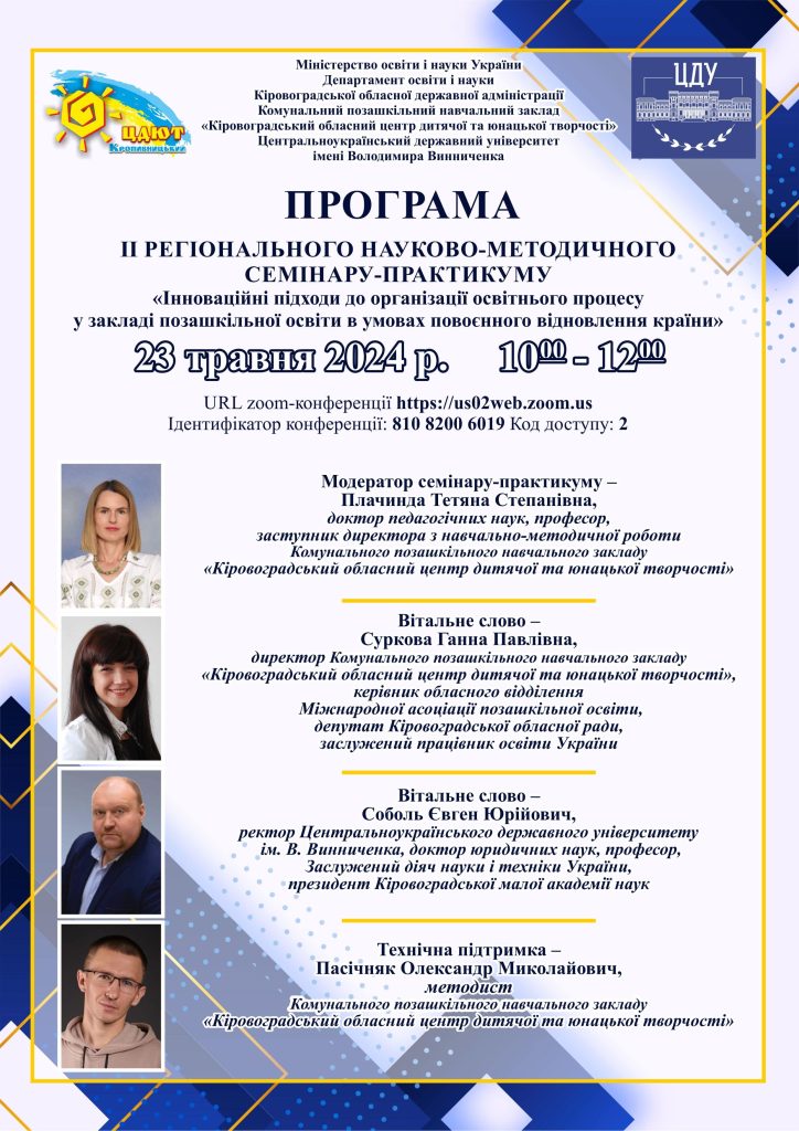 Програма ІI Регіонального науково-методичного семінару-практикуму “Інноваційні підходи до організації освітнього процесу у закладі позашкільної освіти в умовах повоєнного відновлення країни”