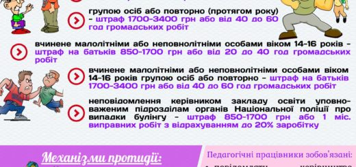 Булінг має небезпечні наслідки для всіх його учасників незалежно від того, яку сторону вони займають. Своєчасна та доречна реакція дорослих викликає у дітей почуття безпеки та захищеності, дає чітке розуміння, що насильство неприйнятне. Пропонуємо...